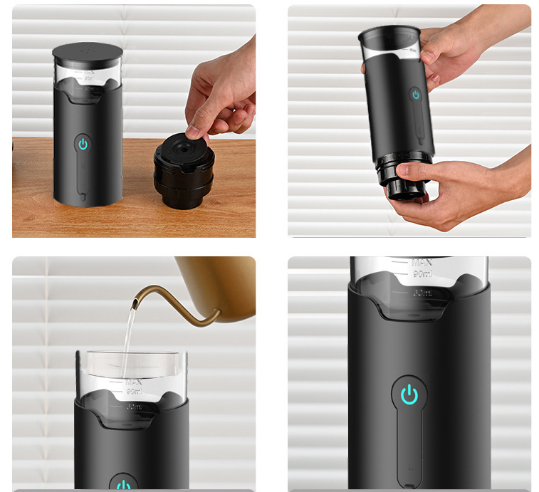 Mini kávovar sa ľahko prenáša, pohodlne sa zmestí do kabelky alebo batohu. Ideálny na cestovanie, do kancelárie, kempovanie alebo do auta.Jednoduché spustenie jedným tlačidlom