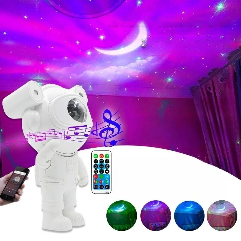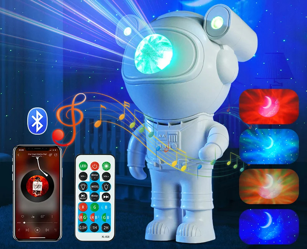 Multifunkčný projektor v podobe astronauta funguje ako lampa a projektor zároveň. Projektor využíva farby modrú, červenú, zelenú a bielu na vytvorenie nádhernej projekcie. Svetlo sa vrhá na strop a steny miestnosti, čím vytvára realistickú hviezdnu nočnú oblohu, poskytuje relaxačnú a atmosferickú atmosféru a núti vás kráčať medzi hviezdami. Projektor nočnej oblohy stimuluje detskú fantáziu a pomáha im rýchlo a ticho zaspať.